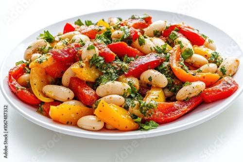 Harissa dressed salad with roasted peppers and butter beans on a white backdrop