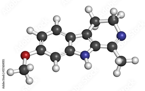 Harmaline indole alkaloid molecule. Found in Syrian rue (Peganum harmala). 3D rendering. Atoms are represented as spheres with conventional color coding.