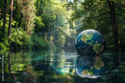 Harmonious Earth: A Serene Planet Floating in Crystal Waters with a Verdant Forest Tapestry as Backdrop