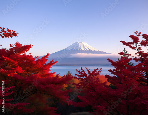 Harmonious Nature: The Scenic Splendor of Mount Fuji Surrounded by Lush Autumn Foliage and Serene Lake Reflections