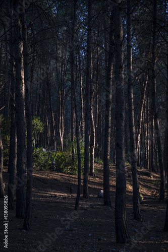 Harsh setting sun light through trees cast heavy shadows in forest vertical