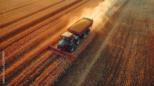 Harvest Time: Aerial View of Tractor Harvesting Golden Wheat Field