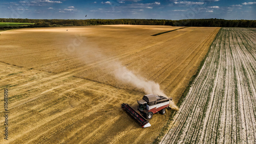 Harvesting by combine harvester in wheat fields on a Sunny autumn day, aerial photography from a drone of farm fields in the seasonal harvest