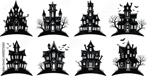 Haunted house silhouettes with gothic architecture, bats, and eerie trees for Halloween, spooky design, horror themes, and fantasy vector art