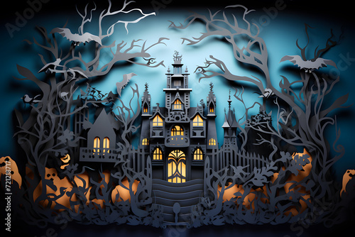 Haunted mansion with ghosts and bats paper cut background
