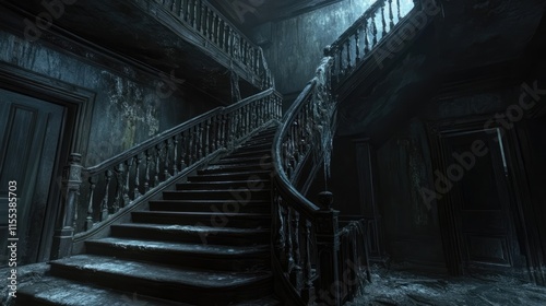 Haunting staircase in a decaying asylum with eerie lighting and historical charm