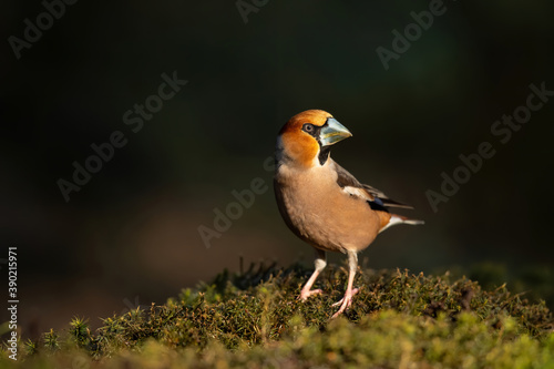 Hawfinch (Coccothraustes coccothraustes) in the forest of Noord Brabant in the Netherlands. Dark background. Copy space