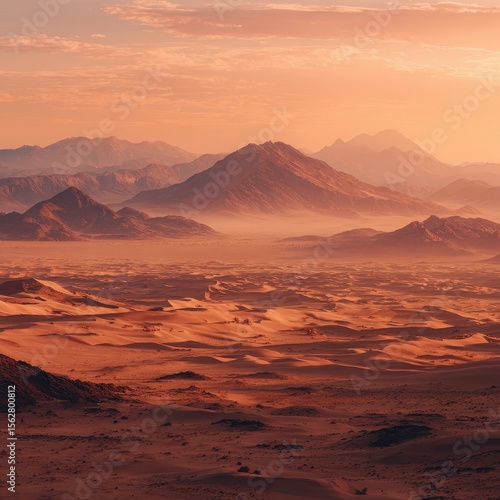 Hazy sunset over a vast, reddish desert landscape, with layered mountains in the distance, creating a serene, warm, and somewhat hazy atmosphere