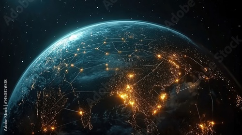 HD Earth view from space with city lights and glowing network connections.