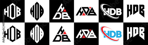 HDB letter logo design in six style. HDB polygon, circle, triangle, hexagon, flat and simple style with black and white color variation letter logo set in one artboard. HDB minimalist and classic logo