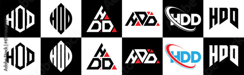 HDD letter logo design in six style. HDD polygon, circle, triangle, hexagon, flat and simple style with black and white color variation letter logo set in one artboard. HDD minimalist and classic logo