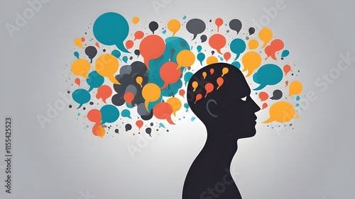 Head filled with speech bubbles, exclamation marks and question marks, silhouette vector illustration of mental health concepts, anxiety, overthinking on grey background
