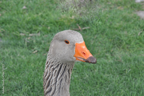 Head of a gray goose on a background of green lawn. The yellow beak of the goose is smeared in mud.