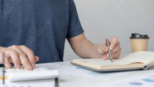 Head of accounting is recording the company's financial growth statistics using graphs as a reference for reviewing and analyzing the results, Taking notes and analyzing data graphs in office.