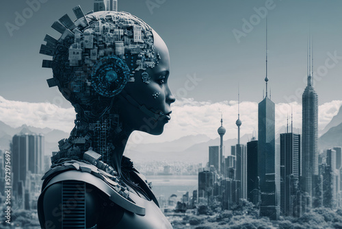 Head Of Young Woman In Form Of Metropolis. It Is Against Background Of City Buildings. Concept of Modern Technological Development.