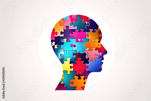 Head silhouette illustration and puzzle pieces, white background. Generative AI