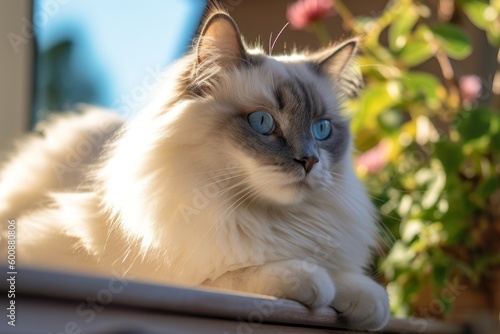 Headshot portrait photography of a smiling ragdoll cat climbing against a sunlit patio. With generative AI technology