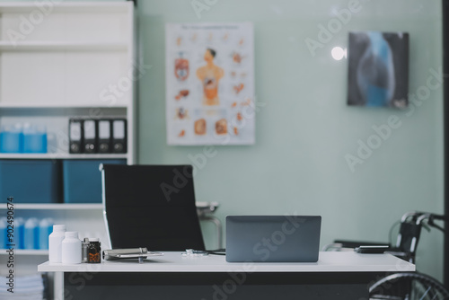 Health care billing statement with stethoscope, bottle of medicine for doctor's work in medical center stone background.
