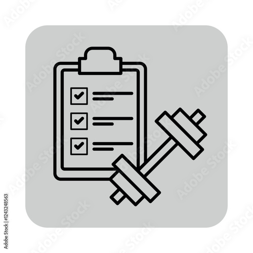 Health checklist and weight lifting icon of fitness tracking. Clipboard with checkboxes, symbolizing goal setting and progress in physical activity