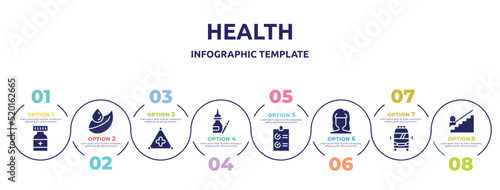health concept infographic design template. included medicine container, leaf and drop, warning triangular, drops of medicine, checked list, woman dark long hair shape, frontal ambulance, mechanical