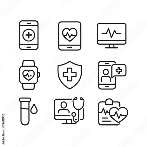 Health monitoring icons with wearable device symbols. Outline symbols. Line design