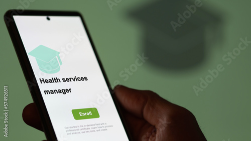 Health services manager program. A student enrolls in courses to study, to learn a new skill and pass certification. Text in English