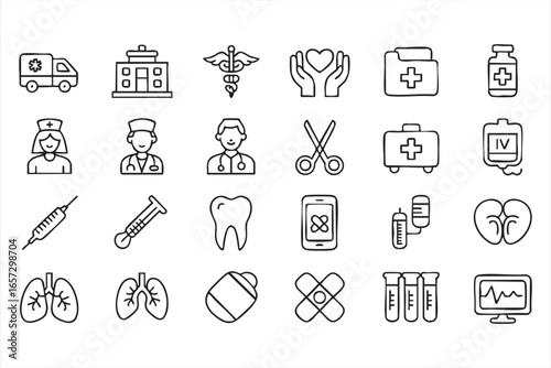 Health Symbols: Hospital, Syringe, Prescription, and Medical Assistance