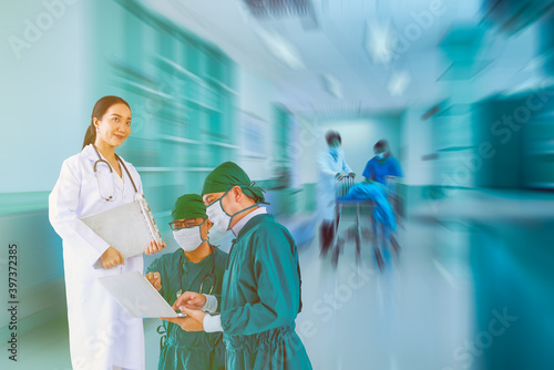 Healthcare and medical concept. woman doctor and two surgery doctos on emergency hospital case background