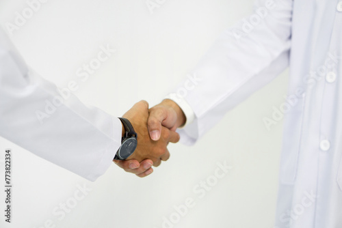 Healthcare professional and scientist in white lab coat shaking hand on white background. Closeup