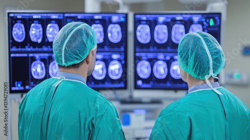 Healthcare Technology patient concept. Medical professionals examining brain scans on computer screens