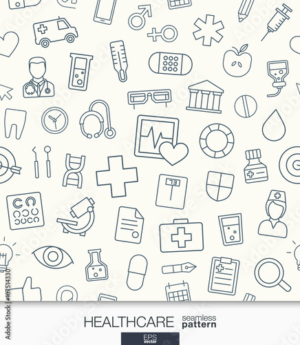 Healthcare wallpaper. Medical seamless pattern. Tiling textures with thin line web icons set. Vector illustration. Abstract health care and medicine background for mobile app, website, presentation.