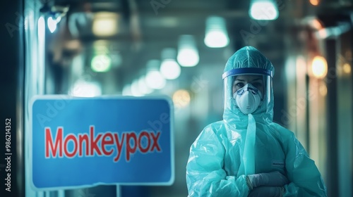 Healthcare worker in full protective suit and mask near 'Monkeypox' sign. Represents virus containment and healthcare response.