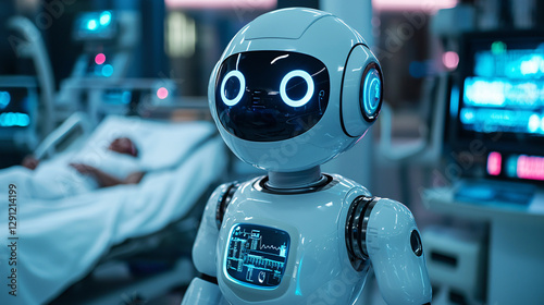 healthtech Futuristic robot in a hospital setting assisting a patient.