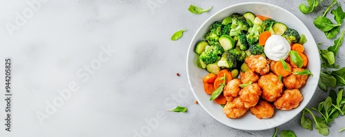 Healthy air-fried chicken and vegetables on a grey marble table, emphasizing fresh ingredients and modern cooking, gourmet meal, marble background, vibrant, balanced