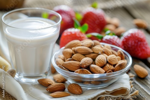 Healthy Breakfast Arrangement with Mixed Nuts, Fresh Fruits, and Almond Milk