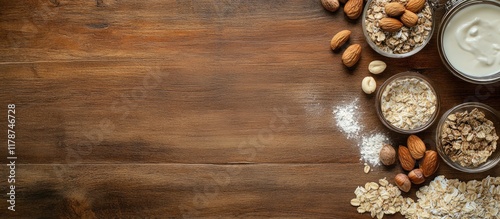Healthy breakfast ingredients layout with fruit nuts muesli and yogurt on wooden table showcasing empty space for creative text ideas