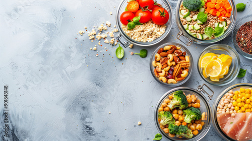 Healthy fitness meal prep featuring fresh ingredients for balanced nutrition on a table