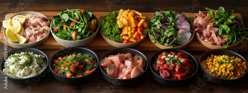 Healthy high-protein dishes arranged on a wooden dining table with vibrant salads and lean meats for a nutritious meal