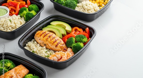 Healthy Meal Prep with Grilled Chicken, Broccoli, Quinoa, Shrimp, and Colorful Vegetables in Black Containers