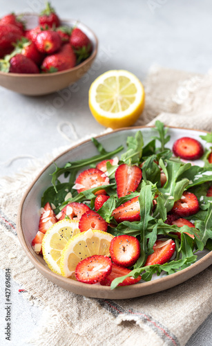 Healthy organic diet salad with arugula, strawberries and almonds.