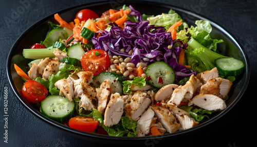Healthy salad with chicken, tomatoes, cucumber, lettuce, carrot, celery, red cabbage and mung bean on dark background. Proper nutrition. Dietary menu. Flat lay. Top view