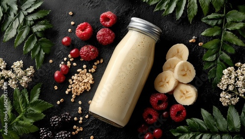 Healthy smoothie in glass bottle, surrounded by fresh fruit
