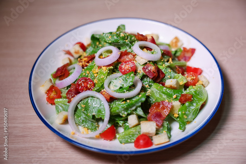 Healthy vegetable salad of fresh tomato, onion, lettuce on plate. Diet menu. Top view.