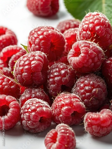 Heap of fresh raspberries with leaves on a white background, featuring a high-quality photo