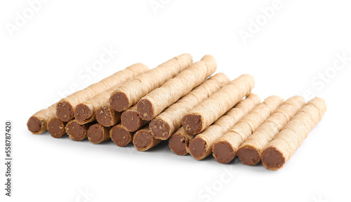Heap of tasty wafer rolls with boiled condensed milk isolated on white background