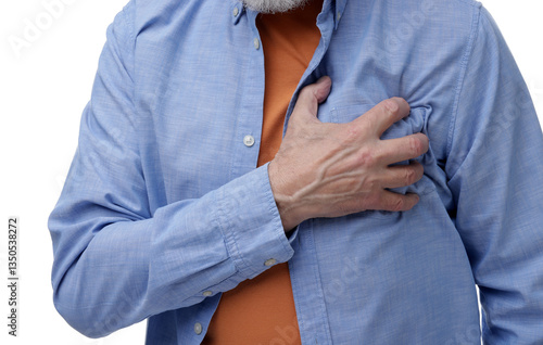 Heart attack. Senior man suffering from pain in chest on white background, closeup