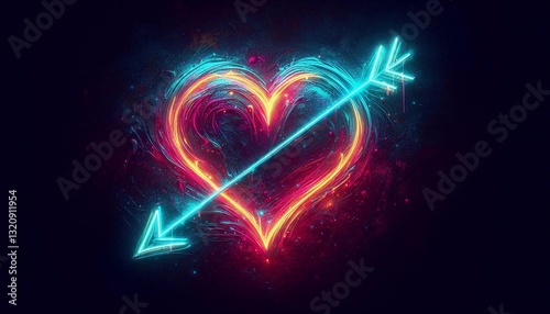Heart drawn with glowing neon paint in the center, contrasting shadows, deep textures, glowing effects, atmospheric composition, arrow in the heart, romantic and mysterious atmosphere.