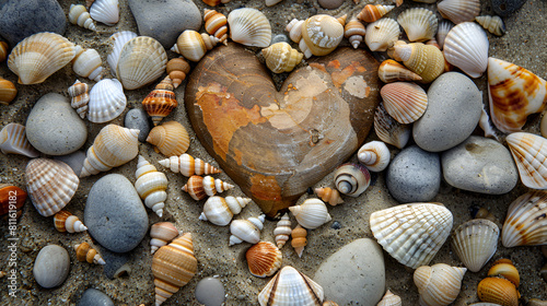 Heart shape composition of seashells on sand flat lay ,generative ai