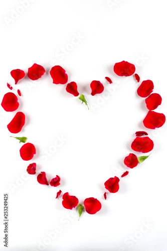 Heart shape made of red rose petals, on white background. Top view, copy space for text