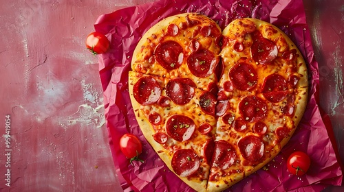 Heart shaped pizza pepperoni for Valentines day on red paper background